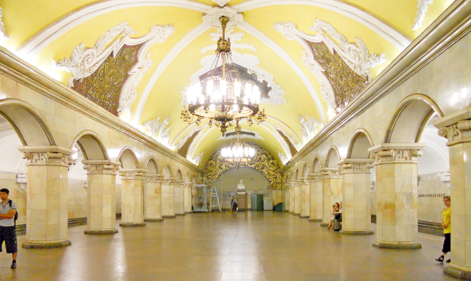 1. Estación Komsomolskaya. Reconocida entre todas por el ostentoso lujo en sus techos amarillo pálido con decoración barroca, del que penden lámparas impresionantes y con 68 columnas jónicas de mármol blanco sosteniendo la estructura. Ocho mosaicos resumen la lucha por la independencia y la libertad de Rusia.
