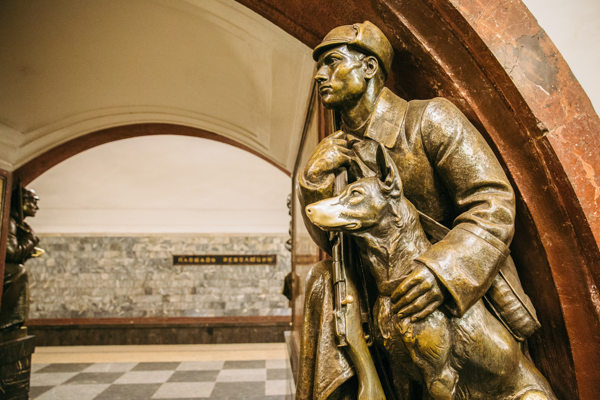1. Estación Ploshchad Revolyutsii, adornada por 76 figuras de bronce que se distribuyen entre los 16 arcos de sus plataformas. Representan a los soviéticos en la época de la revolución, soldados, marineros, campesinos. Solo 20 esculturas son diferentes, las demás son repeticiones. Es conocido que los rusos son muy supersticiosos, así que hay que prestar atención a algunas de ellas. La más popular es la del soldado y su perro, cuyo hocico brilla por demás, ya que los moscovitas creen que acariciarlo garantiza tener una buena jornada. Otro mito es la de dar palmadas a un gallo que sostiene una granjera para resolver problemas económicos. Solo hay que sumarse a esta creencia y desear que se haga realidad.